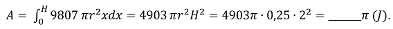 Yechilishi: x chuqurlikda dx balandlikda gorizantal qatlam ajratadi (rasmga qarang). P og’irlikdagi tuproq qatlamini x balandlikka ko’tarishga sarf bo’ladigan A ish Px ga teng. x chuqurlikning kichik dx kattalikka o’zgarishi V hajmning dV=πr2 dx kattalikka va P og’irlikning dP = 9807 πr2 dx kattalikka o’zgarishiga olib keladi, bunda bajariladigan A ish dA = 9807 πr2 xdx kattalikka o’zgaradi. Bu tenglikni x o’zgaruvchi O dan H gacha o’zgarganda integrallab topamiz: